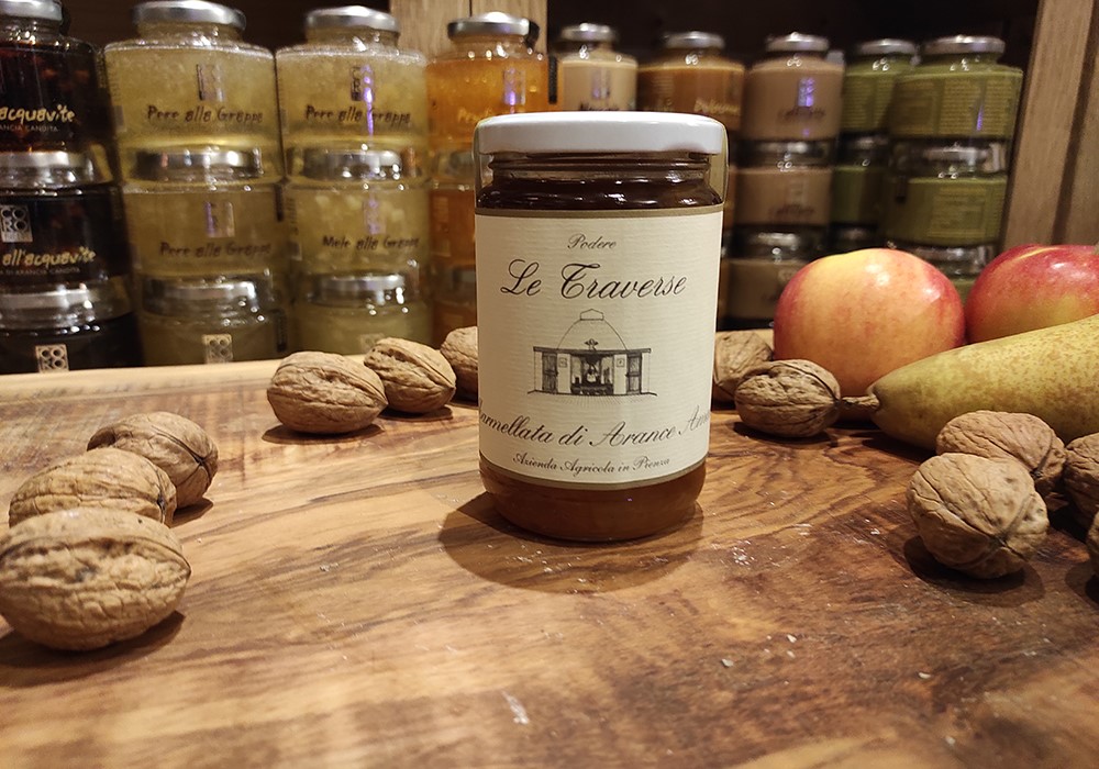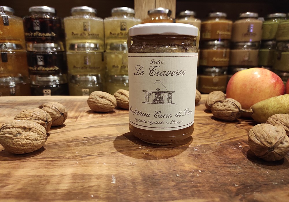 Questa marmellata è prodotta artigianalmente a Pienza e senza conservanti e coloranti. Molta della frutta presente all’interno è degli alberi del frutteto di Pienza. Viene cotta poco e viene usato poco zucchero e consente al prodotto di mantenere il sapore dei frutti.